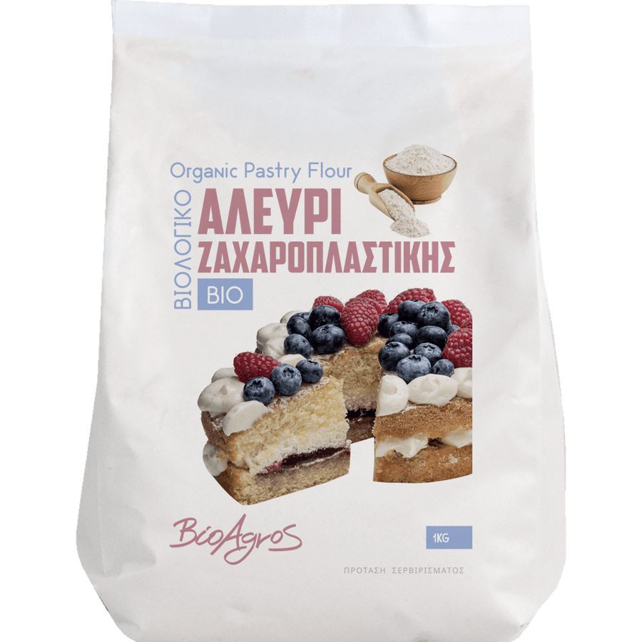 Βιολογικά συστατικά: 100% αλεύρι μαλακού σταριού ζαχαροπλαστικής (τύπου 1050)