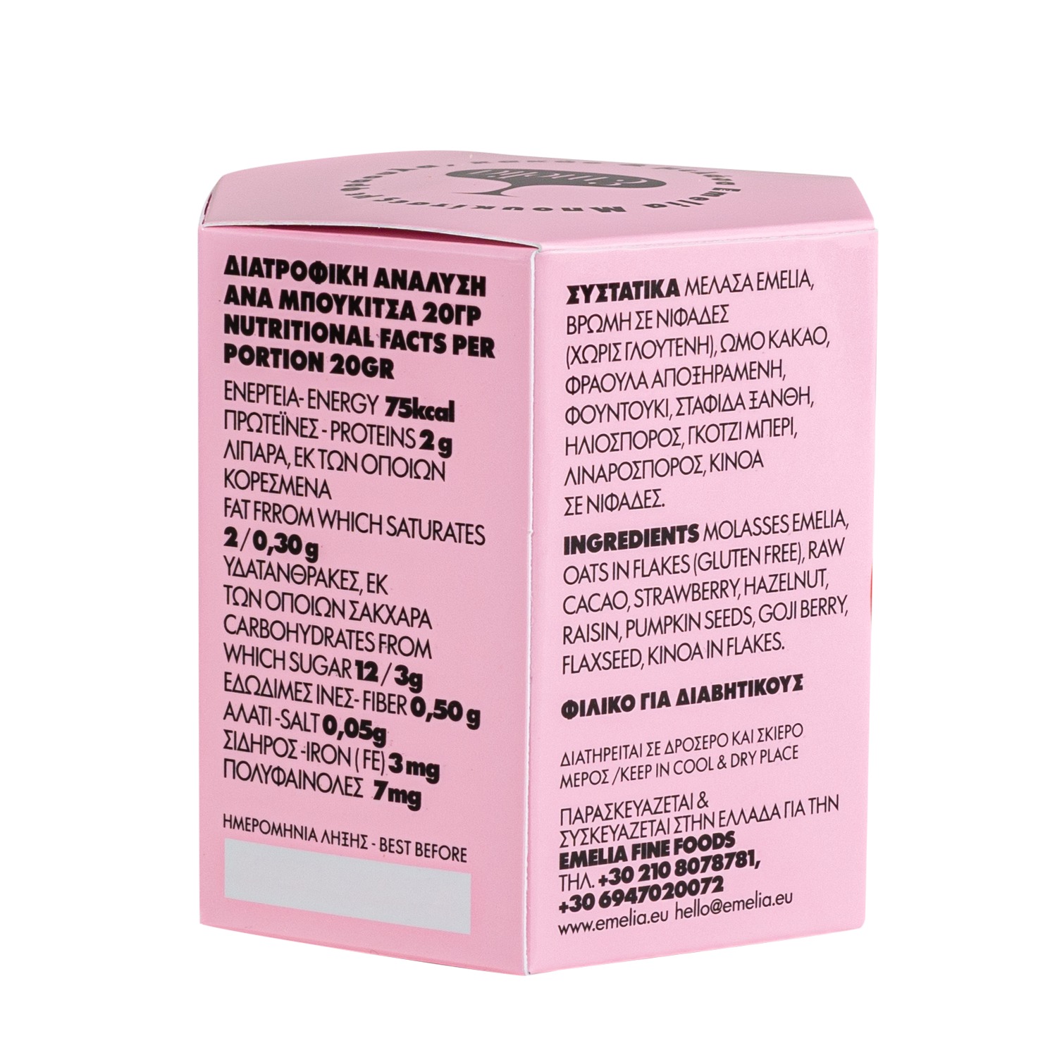 Συστατικά: Μελάσα Emelia, Βρώμη σε νιφάδες (χωρίς γλουτένη), Ωμό Κακάο, Φράουλα αποξηραμένη, Φουντούκι, Σταφίδα ξανθή, Ηλιόσπορος, Γκότζι μπέρι, Λιναρόσπορος καφέ κοπανιστός, Κινόα σε νιφάδες.