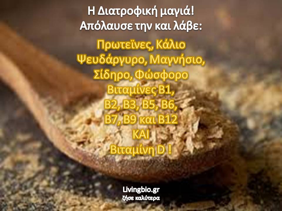 Σημείωση: η ειδική επεξεργασία ξήρανσης που χρησιμοποιήθηκε για την παρασκευή αυτής της διατροφικής μαγιάς αναστέλλει την ζύμωση της καλλιέργειας του μύκητα ώστε να μειωθούν οι πιθανότητες εντερικών διαταραχών.