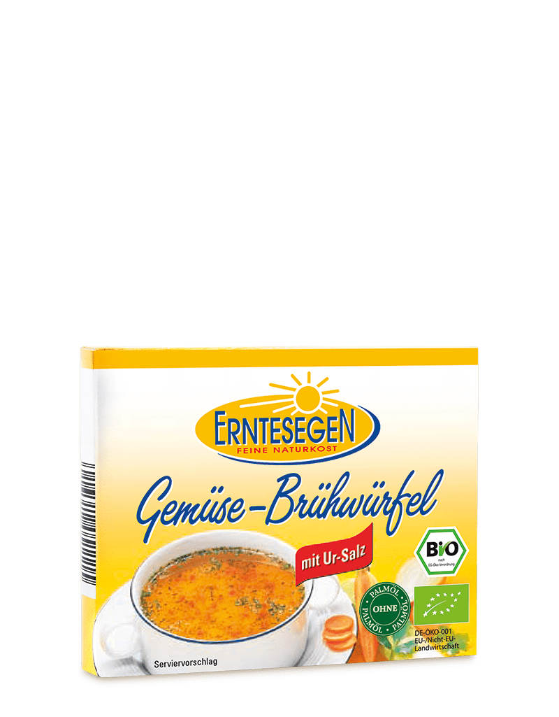 Βιολογικά συστατικά: ορυκτό αλάτι, λίπος καριτέ, σιρόπι γλυκόζης, άμυλο καλαμποκιού, καρότα (2,4%), πράσο, εκχύλισμα μαγιάς, καραμελωμένη ζάχαρη, σκόνη κρεμμυδιού (1,2%), μοσχοκάρυδο, σκόνη παστινάκη (0,7%), συμπυκνωμένος χυμός λαχανικών (καρότα, κρεμμύδια), σκόρδο, μαϊντανός, κουρκουμάς, φύλλα σέλινου, σκόνη κολοκύθας (0,1%), ρίζα λεβιστικού, ηλιέλαιο, φύλλα λεβιστικού, σπόροι μάραθου.