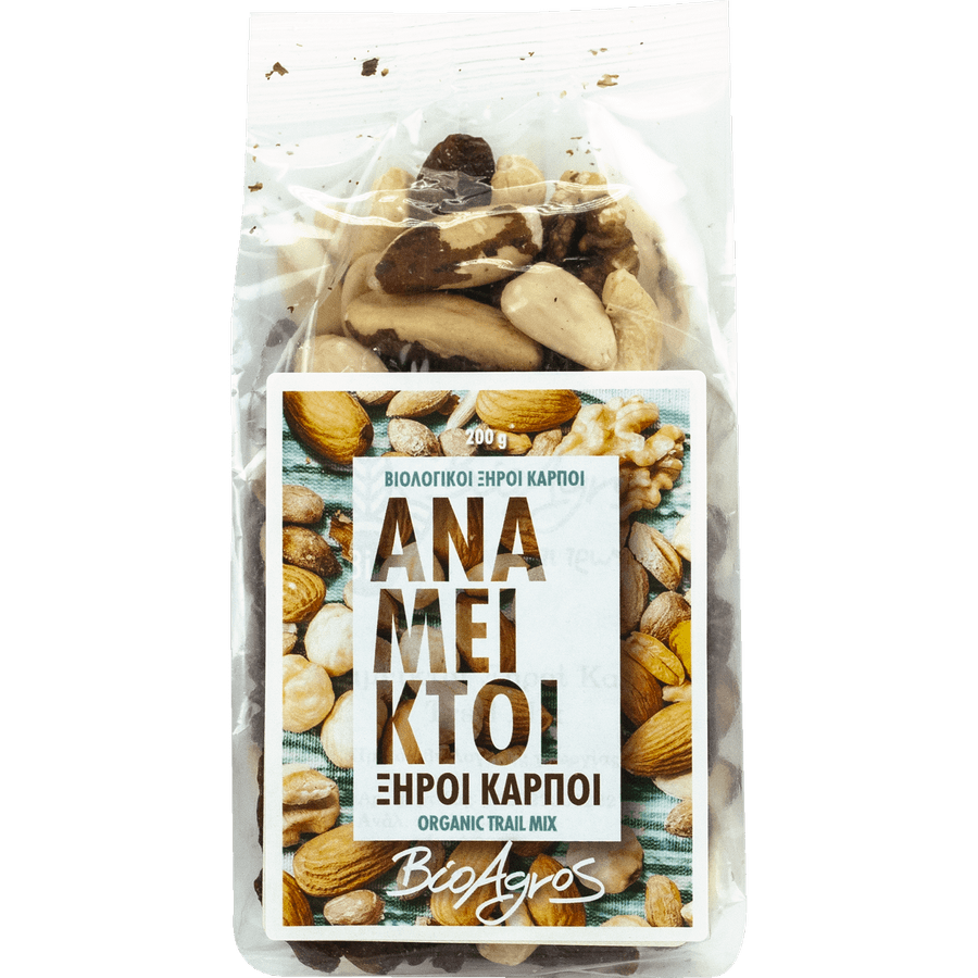 Βιολογικά συστατικά: ξηροί καρποί 52% (φουντούκια, αμυγδαλόψιχα λευκή, κάσιους, καρυδόψιχα, φυστίκι Βραζιλίας), σταφίδα ξανθή 48%.